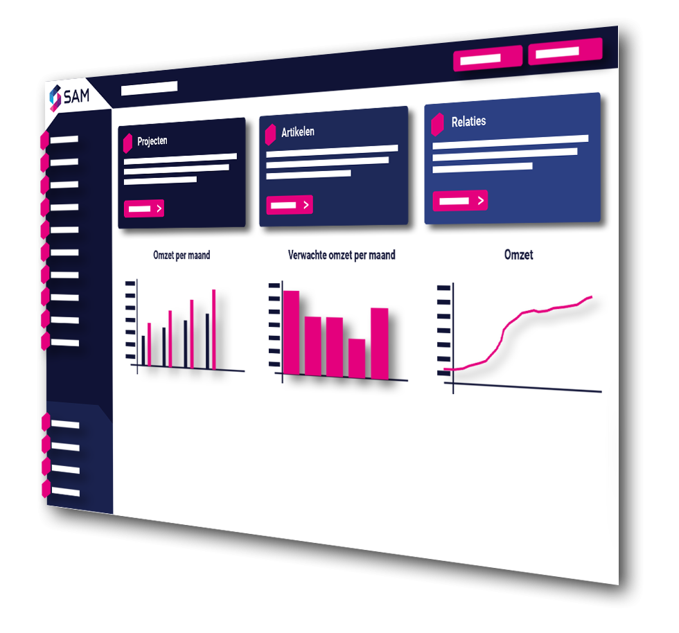 Of je nu actief bent in de verkoop, verhuurbranche, evenementenbranche, opslagbranche of een andere branche, SAM kan je helpen je operationele processen te verbeteren en je bedrijf naar een hoger niveau te tillen. Met SAM kun je de controle behouden, inzicht krijgen en de productiviteit maximaliseren.