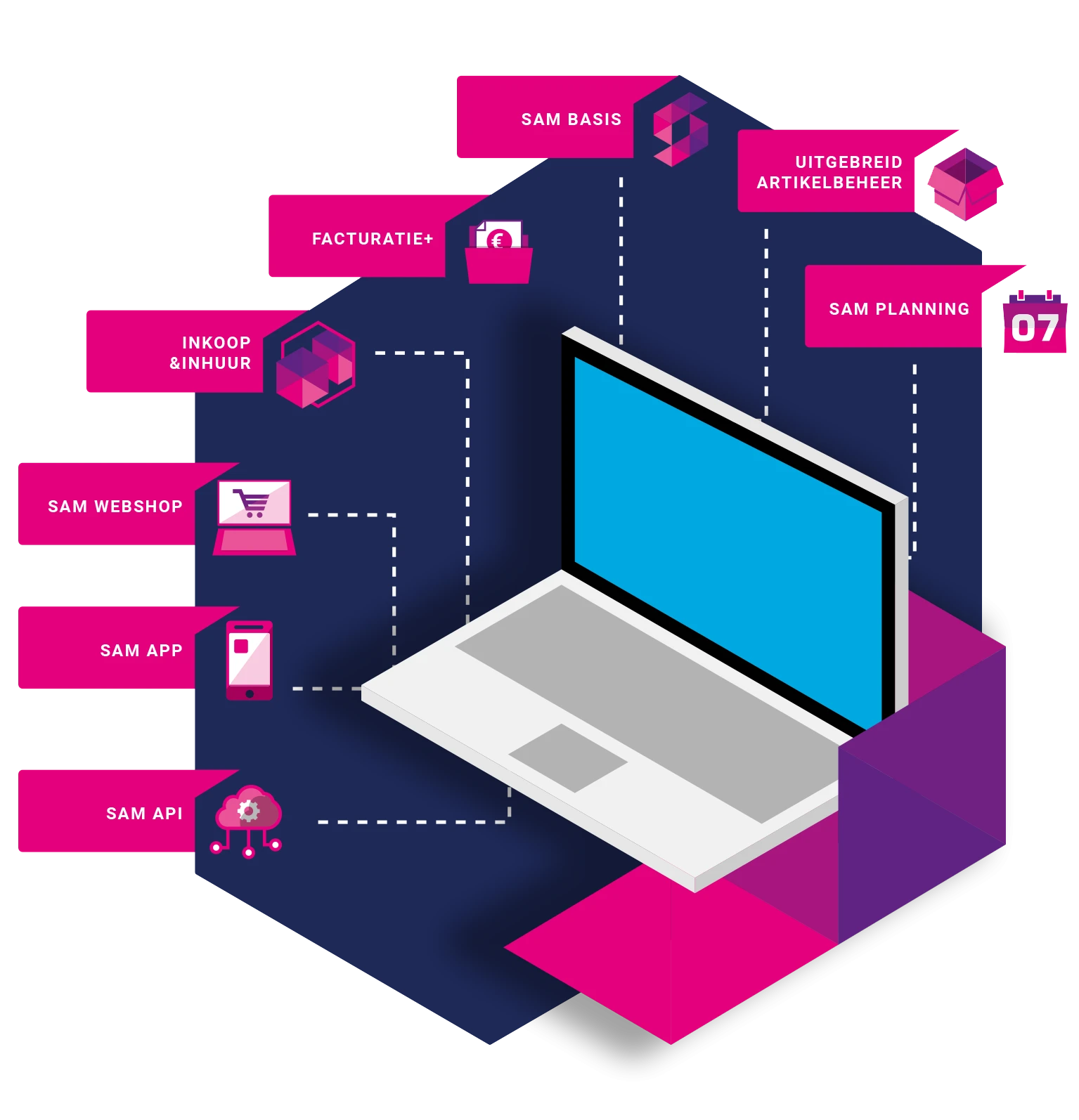 Ben jij verhuurder en wil jij elke dag zorgeloos klantbeloftes waar kunnen maken? Met SAM beheer jij eenvoudig jouw assortiment en prijzen, verhuur je met een druk op de knop jouw aanbod en heb je realtime inzicht in lopende orders en openstaande posten.